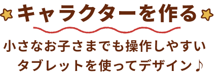 タブレットを使って好きなパーツを選び、自分だけのオリジナルキャラクターを生み出す“はじめて”のキャラクターのデザイン体験♪体験後には、オリジナルキャラクターカード、限定デザインネックストラップ(カードケース)をお持ち帰りできます。