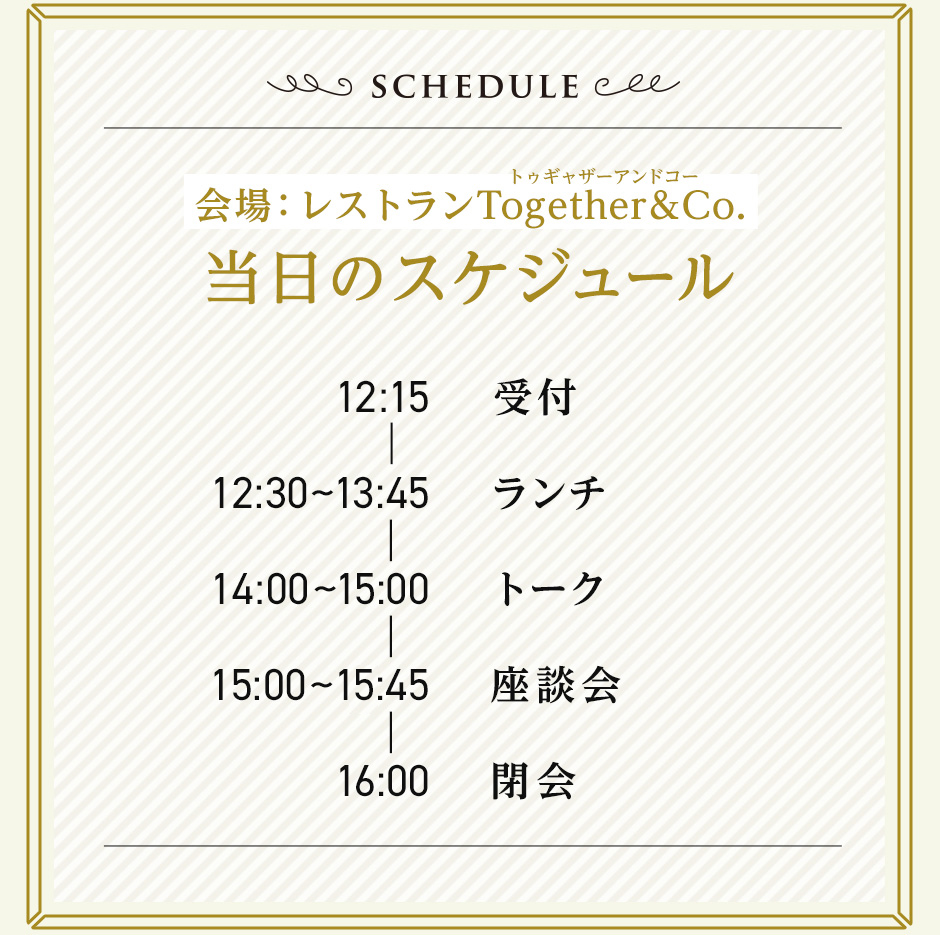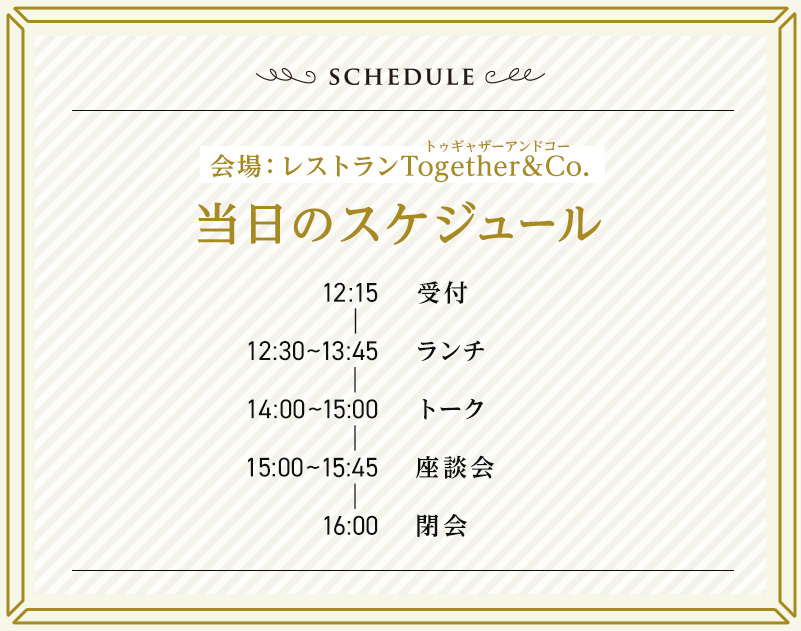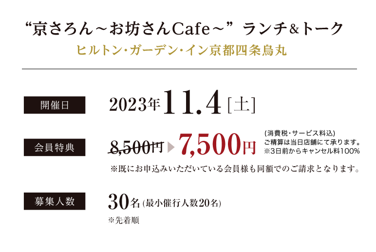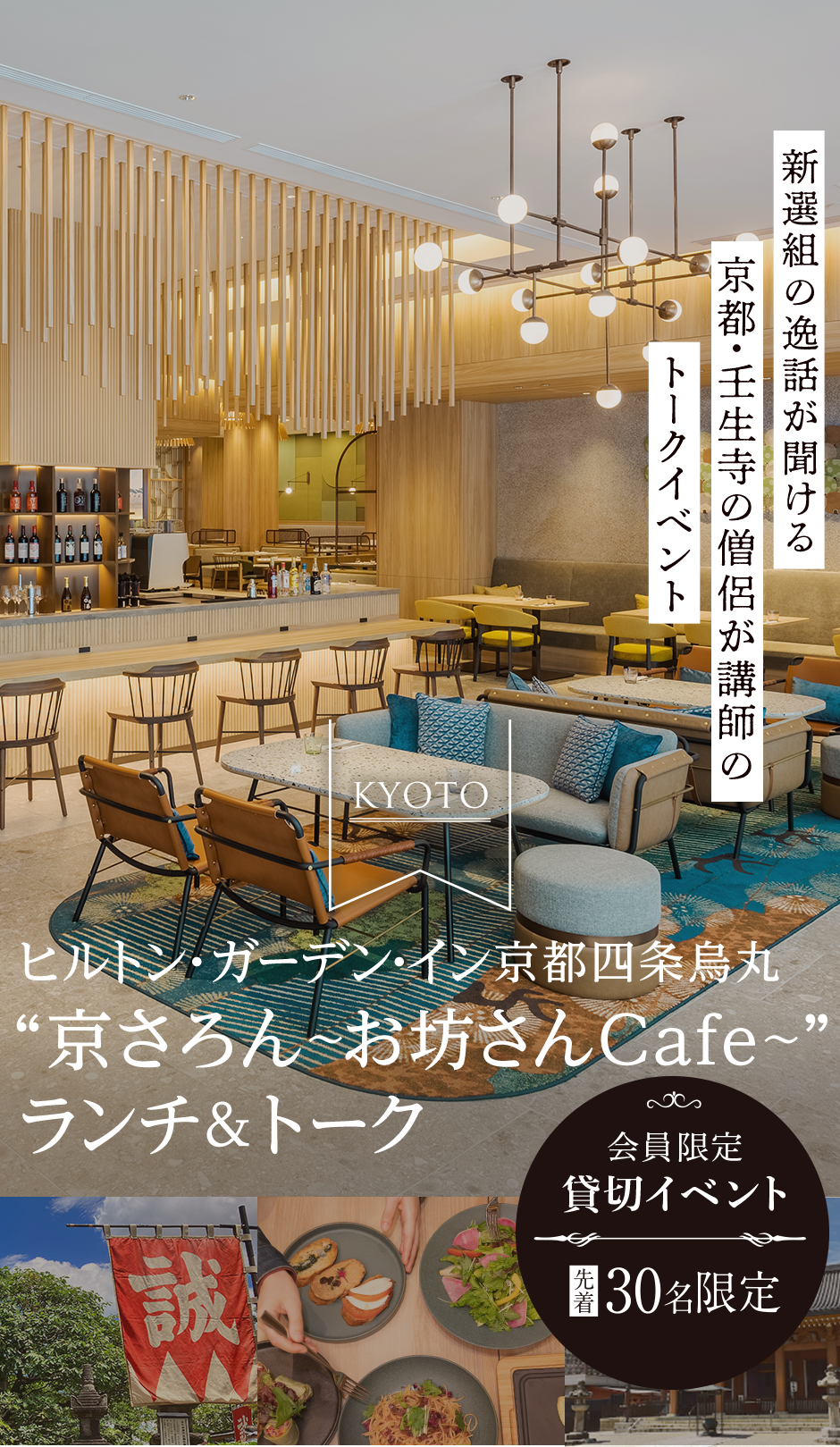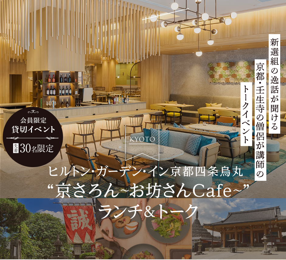 今回「Together&Co.」で、京さろん〜お坊さんCafe〜とランチを開催いたします。お寺を身近に感じていただくトークイベントとして、新選組が結成された壬生の地にある壬生寺の貫主松浦俊昭氏を迎え、「壬生寺と新選組」をテーマにお話しいただきます。ゆったりと広く開放感ある店内でシェフ自慢のランチを満喫し、貴重な僧侶のお話を楽しみませんか?