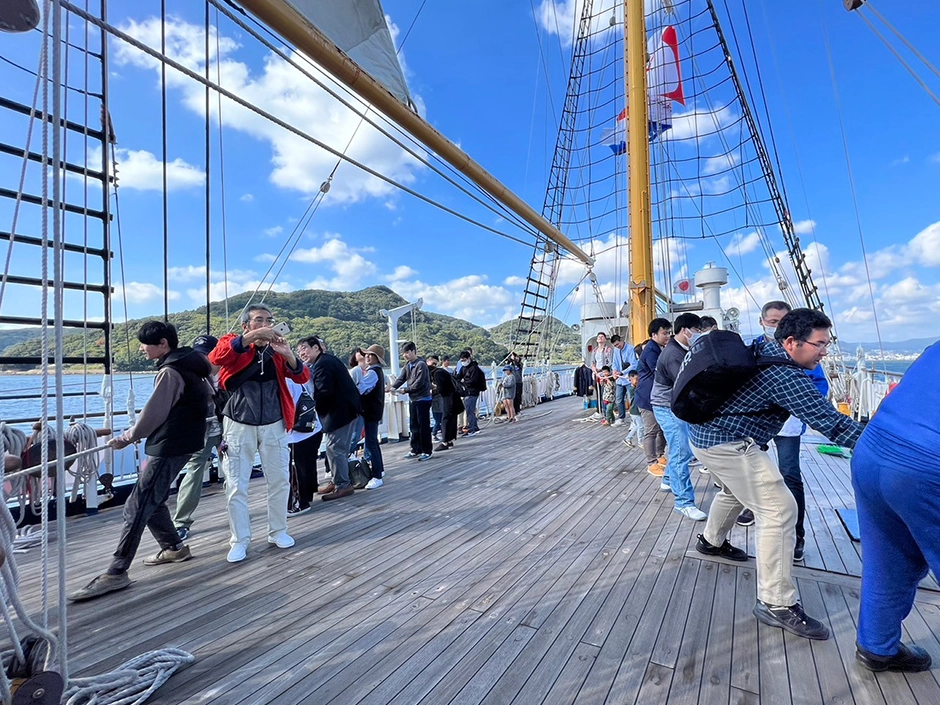 「バウスプリット」は帆船の船首から前方へ伸びている部分こと。船の先端で潮風を感じながら、記念撮影ができます。
