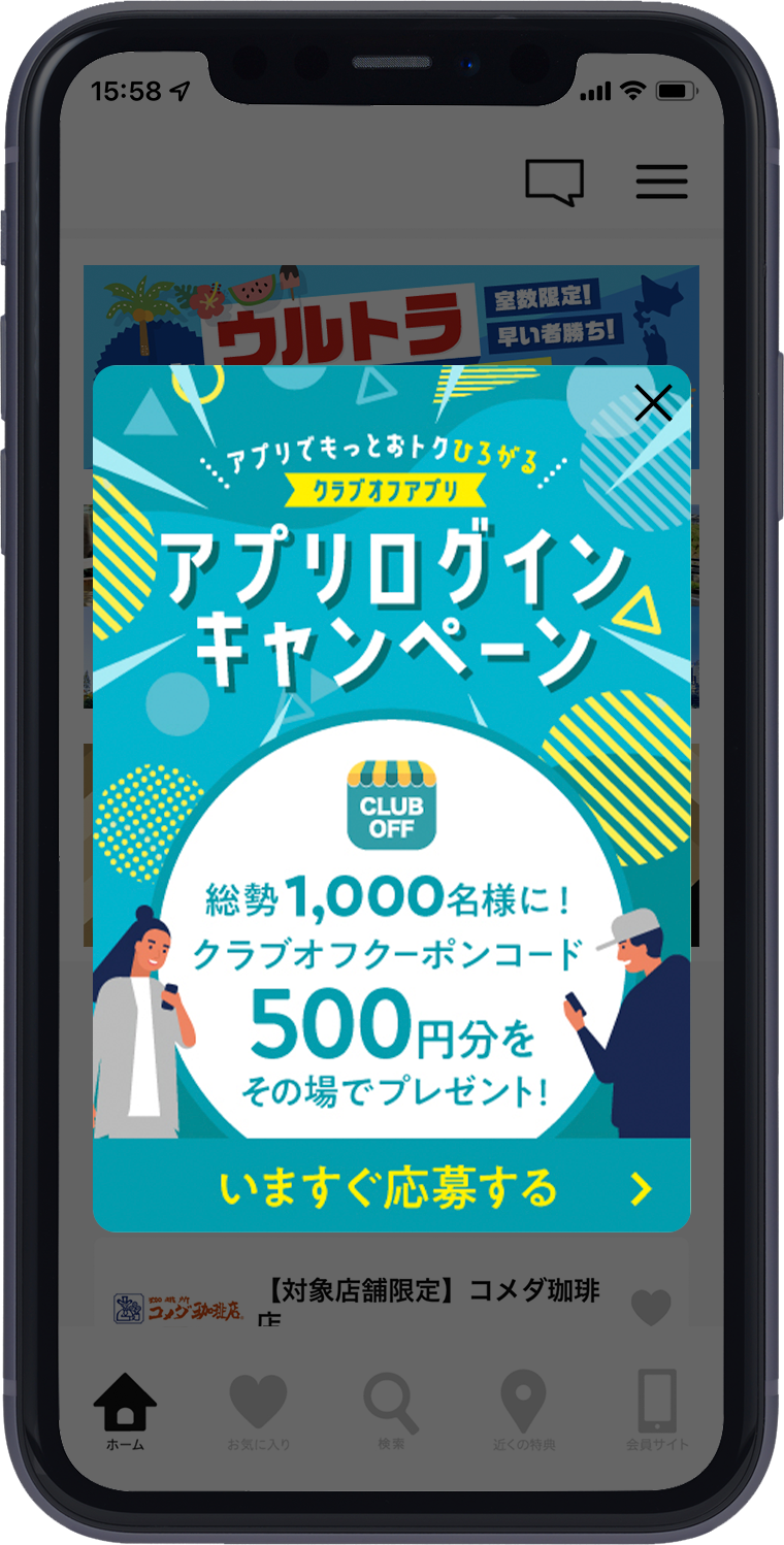 | 概要 | 当クラブで使えるクーポンコード500円分を総勢1,000名様にその場でプレゼント! まだクラブオフアプリをお持ちでない方はこちら |