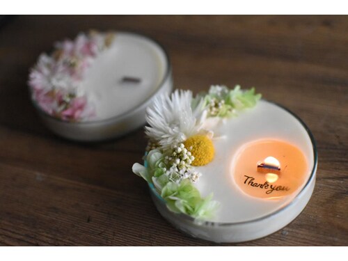 火を灯すとメッセージが浮かびあがる特別なキャンドル作り体験♪好きな色と香り、花材を選べます。大切な人への感謝の気持ちや自分へのご褒美に想いを込めて創りませんか?