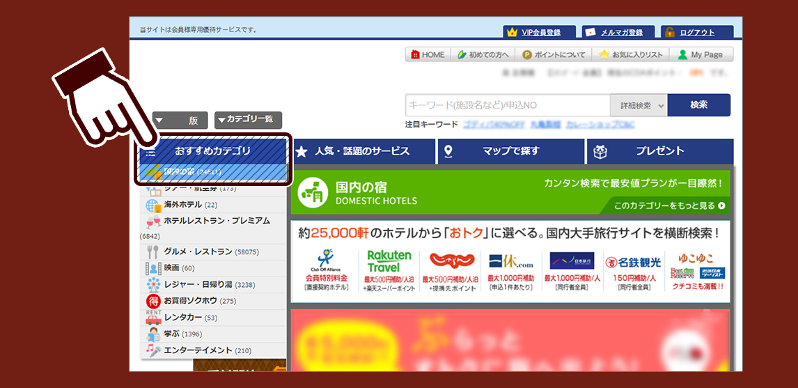 サービスログイン後、ページ上部にある「おすすめカテゴリ」を選択。 開いたメニュー内にある「国内の宿」の項目をクリック。