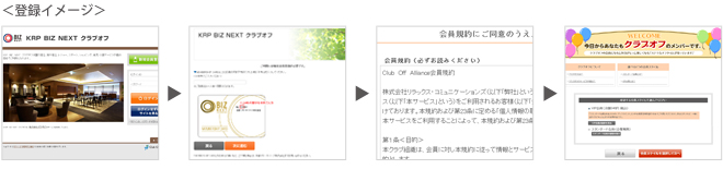 ※確認画面が表示されます。誤りがないか確認の上、「登録」をクリック。 上記画面が表示され、会員登録が完了します。「次へ/Next」をクリックし、サービスをご利用ください。 クラブオフサービスをご利用いただけます。 「KRP BIZ NEXT クラブオフ」サービスのご利用方法 KRP BIZ NEXT クラブオフは、サービスオフィス「KRP BIZ NEXT」をご契約の皆様限定のサービスです。