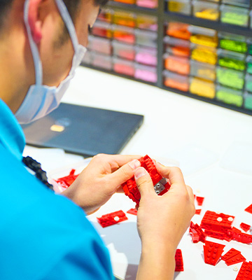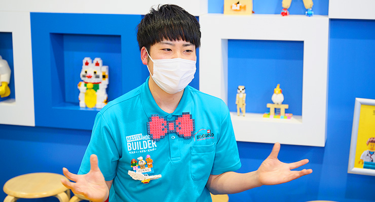 マスター・モデル・ビルダーはレゴランド®・ディスカバリー・センターの専属のレゴ®職人のことを指しまして、現在世界で25人います。仕事の内容としては大きく分けて2つあり、1つはレゴブロックに関わること。ブロックで作品を作ったり、作品の管理をしたりしています。2つ目はお客様と一緒にレゴブロックで遊ぶことです。ワークショップで先生をやって、お子さんにブロックの使い方や遊び方を伝えて一緒に遊んで楽しむ。そんな職業ですね。