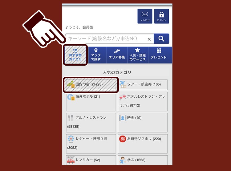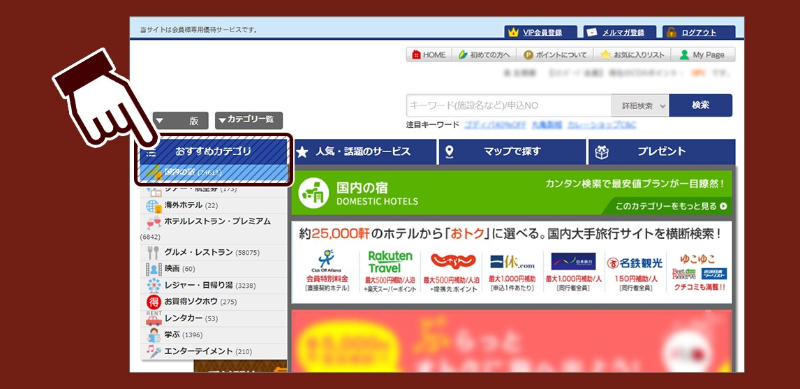 サービスログイン後、ページ上部にある「おすすめカテゴリ」を選択。 開いたメニュー内にある「国内の宿」の項目をクリック。