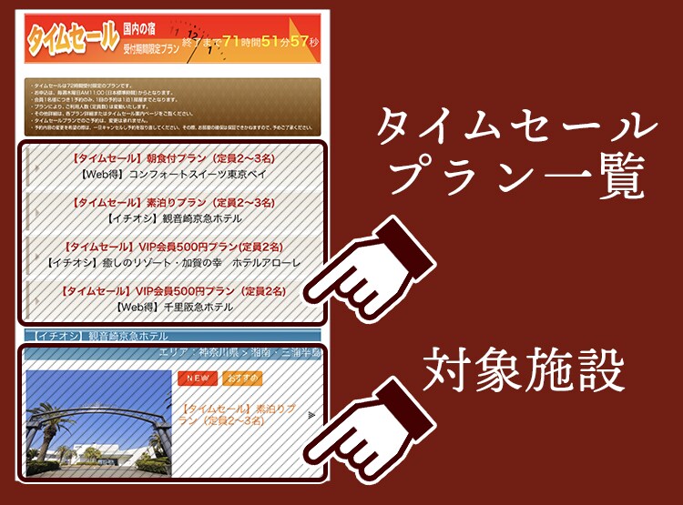 セール期間内に、国内の宿ページを読み込むと、タイムセールバナーが表示されます。 発売時刻前より「国内の宿」ページ画面でお待ちいただいても、 バナーは自動的に表示される仕様ではございませんので 発売時刻になりましたらページの再読み込み(更新)をお願いします。
