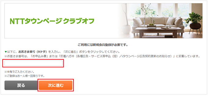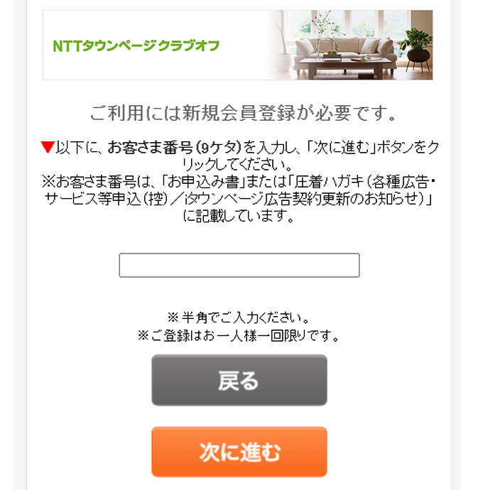 ※お客さま番号は、「お申込み書」または「圧着ハガキ(各種広告・サービス等申込(控)/iタウンページ広告契約更新のお知らせ)」に記載。