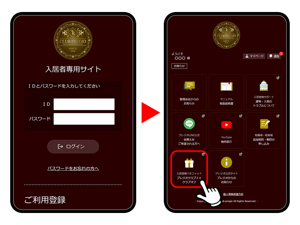 PREGIO CLUB OFFのご利用にあたっては、入居者専用サイト「CLUB PREGIO」のマイページへログインいただき、サービスをご利用ください。