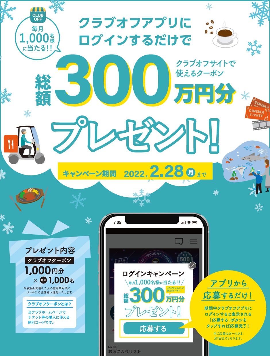 クラブオフクーポン1,000円分×毎月1,000名様