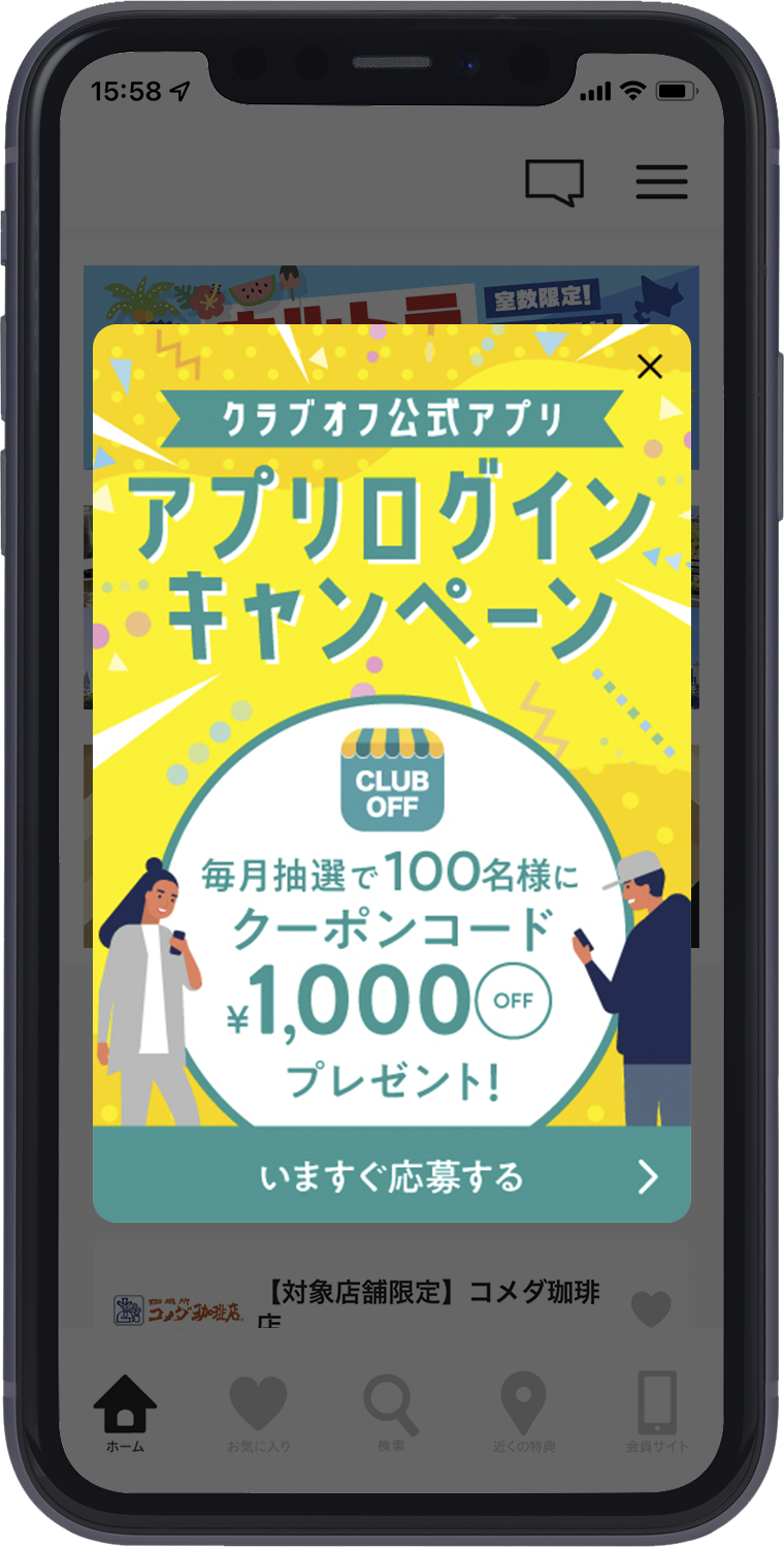 応募方法 クラブオフアプリを起動し、ホーム画面に表示されるキャンペーンバナーよりご応募ください。期間中は、毎日応募できるので、たくさん応募すれば当選確率UP!