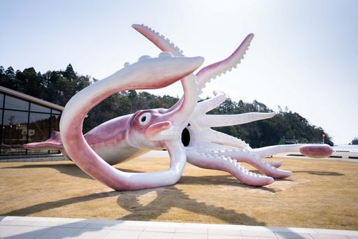 巨大なイカのモニュメント「イカキング」が目印の道の駅。口の中に入ったり、触腕に巻き付かれることができるとSNSでも話題です。能登町名産の船凍イカをはじめとしたイカづくしの特産品がズラリと揃っています。レストランでは、小木イカを使用した能登の郷土料理や新鮮な船凍イカ、カフェではイカスミソフトもお召し上がりいただけます。