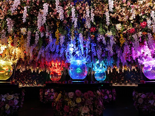 都内の人気ホテルのアフタヌーンティーを楽しんだ後は、光・音・香の幻想的な空間演出に合わせて美しく泳ぐ金魚を鑑賞できる閉館後のアートアクアリウム美術館へ
