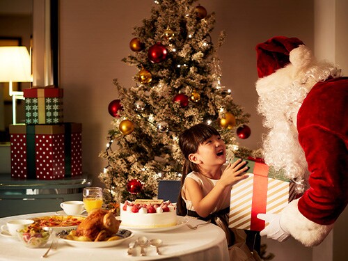 サンタクロースから直接プレゼントをもらえるスペシャル体験!クリスマスムード満点の空間で記念撮影やおしゃべりも♪ホテル自慢のビュッフェでお腹も大満足!